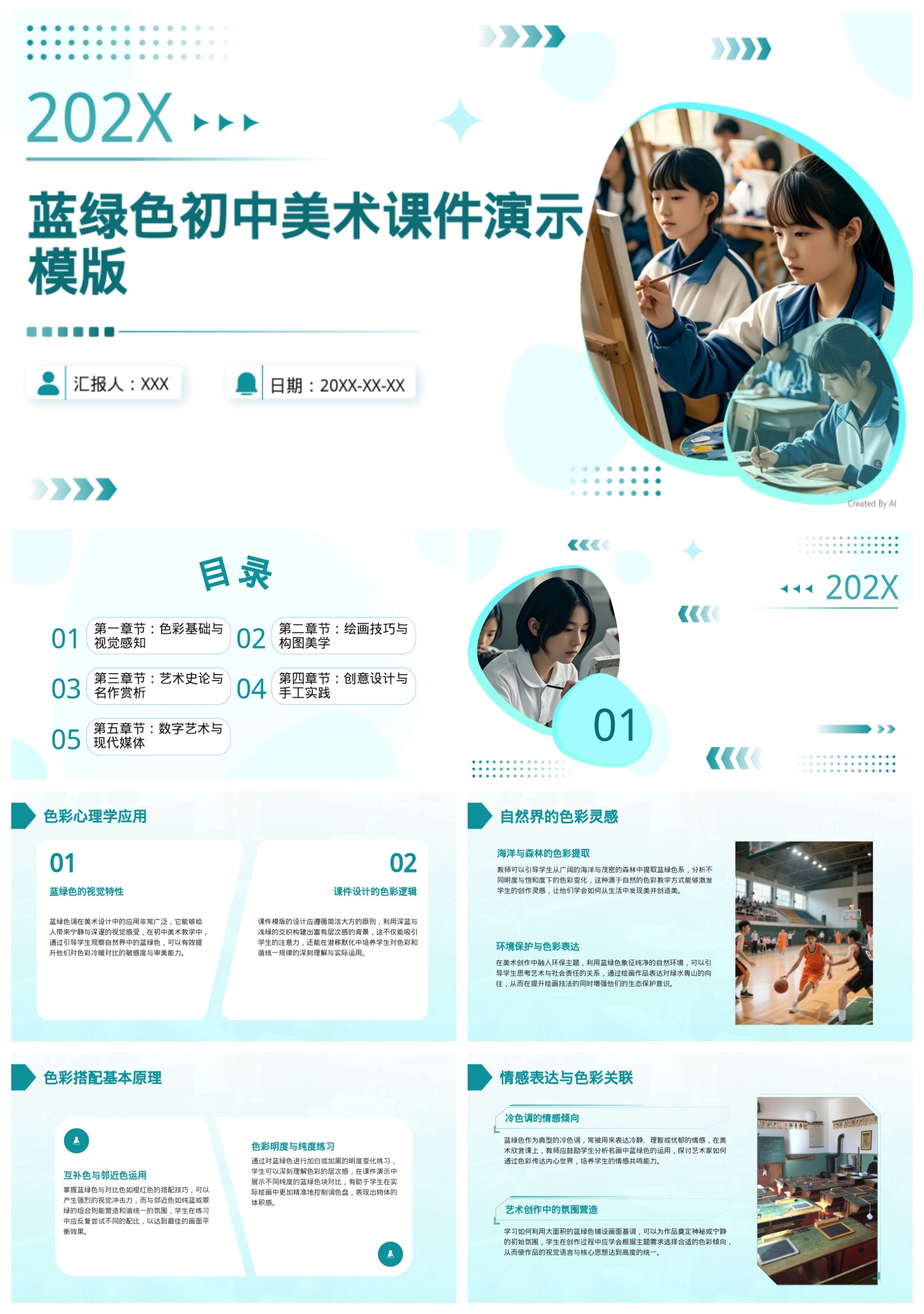 蓝绿色初中美术课件演示模版