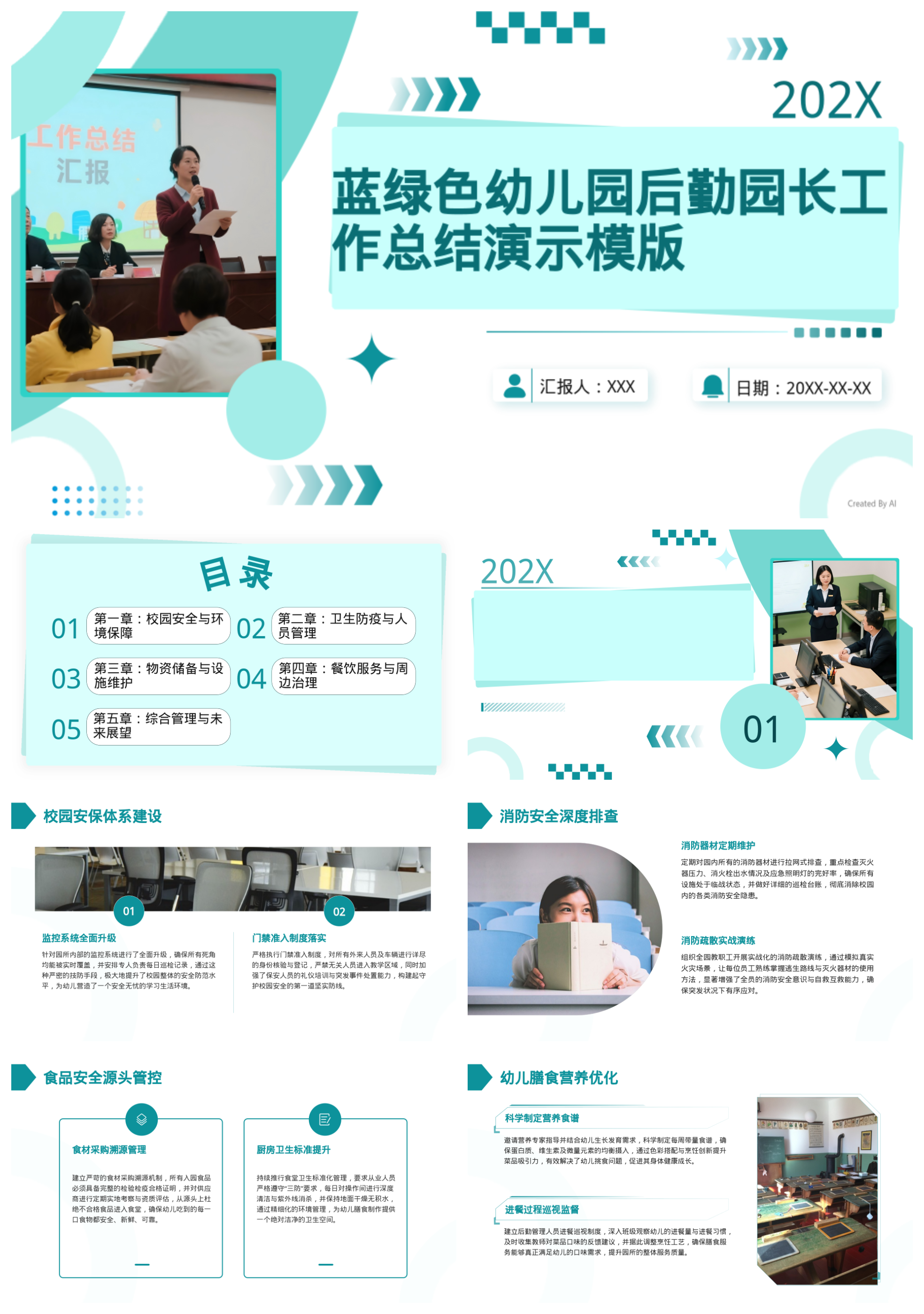 蓝绿色幼儿园后勤园长工作总结演示模版