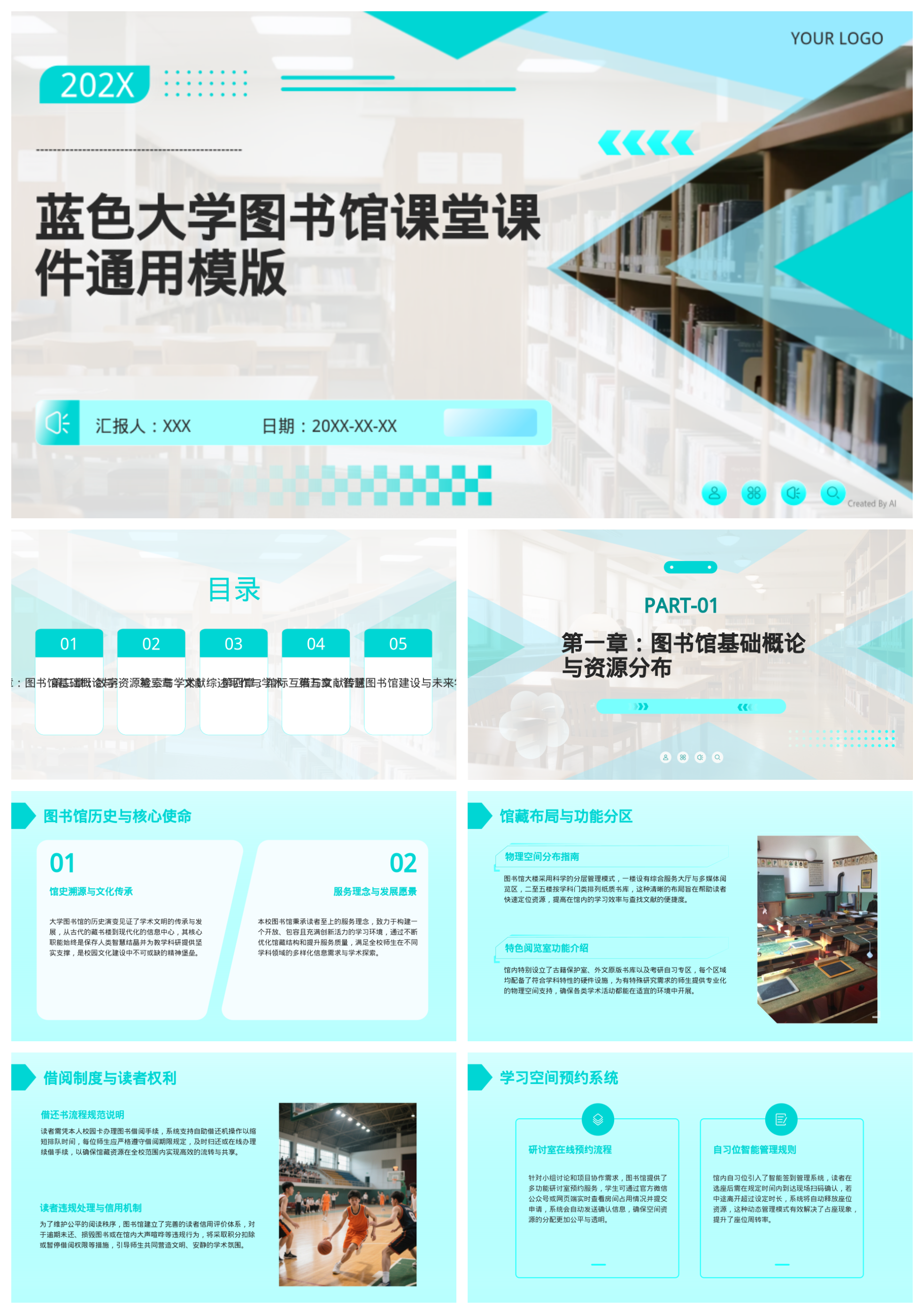 蓝色大学图书馆课堂课件通用模版