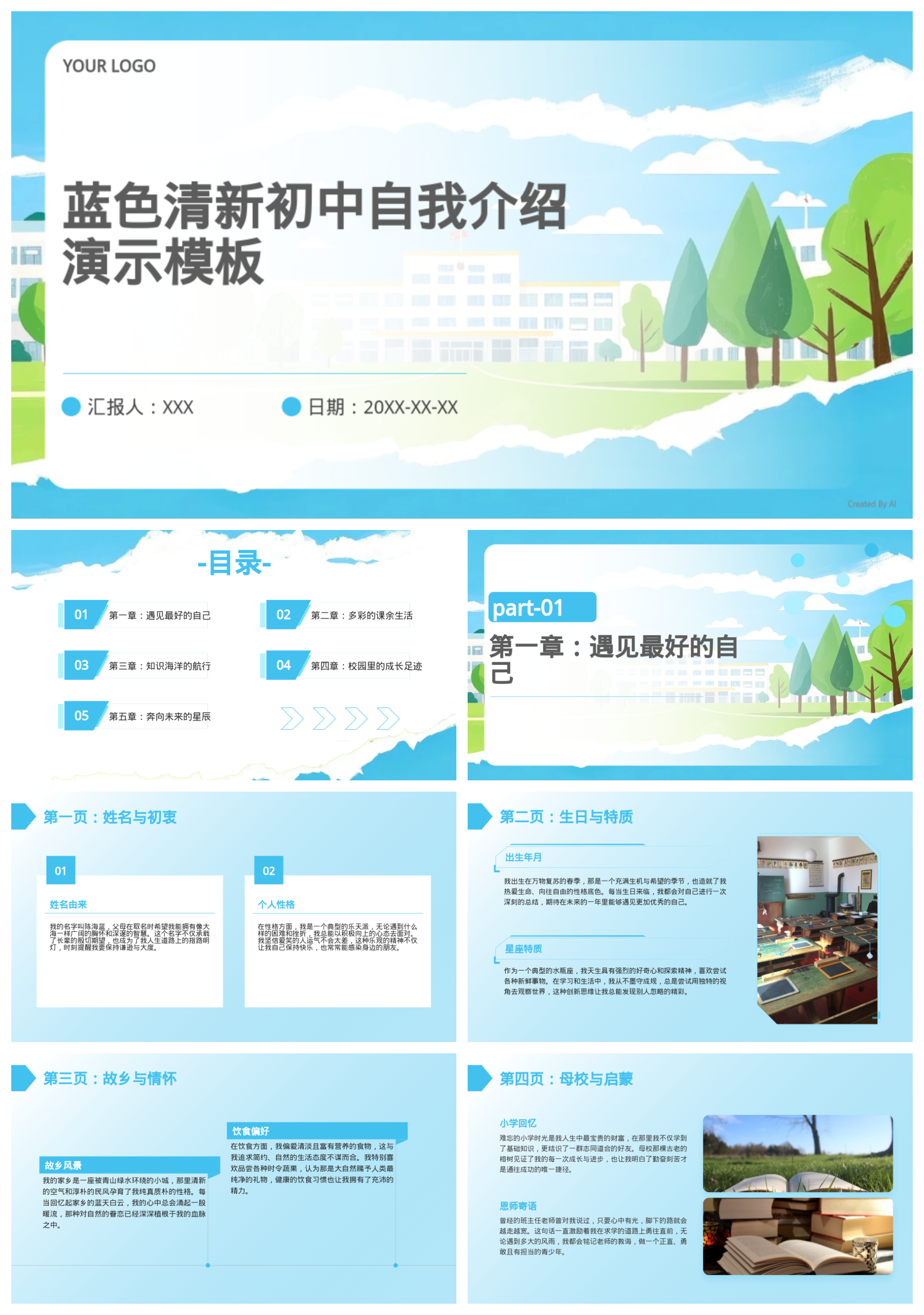 蓝色清新初中自我介绍演示模板